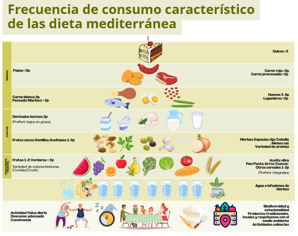 La dieta mediterránea no es un patrón de alimentación restrictivo o estricto, ya que presenta una gran variedad de alimentos locales y respetuosos con el medio ambiente, por lo que se puede adaptar a diferentes gustos y estilos de vida. Además, fomenta un entorno social saludable al promover las comidas en familia o en grupo, la actividad física diaria, el descanso adecuado y la preparación de alimentos en compañía. Se caracteriza por ser rica en frutas y verduras frescas, utiliza el aceite de oliva como principal fuente de grasa, pescado y mariscos, legumbres, frutos secos, cereales integrales y lácteos en moderación, priorizando los fermentados. Asimismo, el consumo de carnes rojas es reducido.